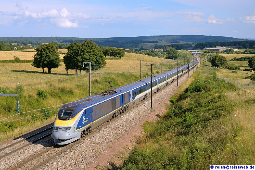 Die Eurostar-Garnitur 3230/3229 ist als EST 9087 von Marseille St. Charles nach London St. Pancras unterwegs; die Reisezeit beträgt 7 Stunden 50 Minuten (Manlay, 06.07.2018).