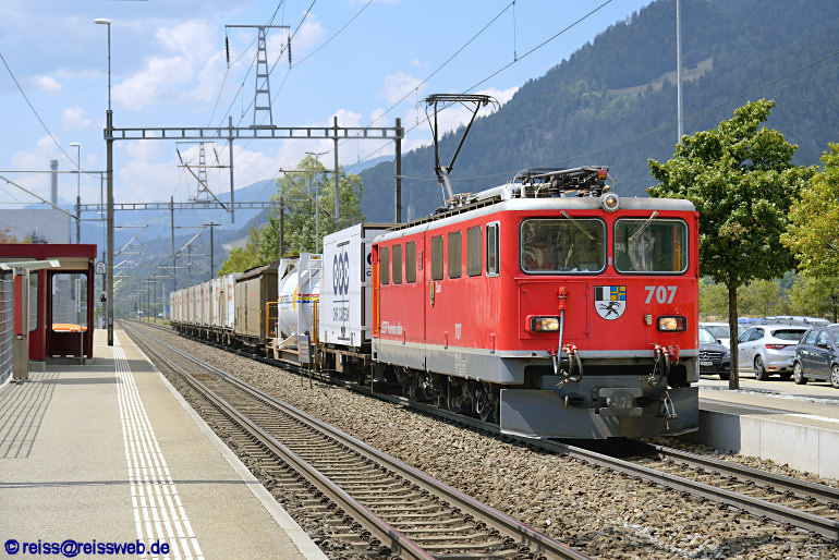 Ge 6/6 II 707 der RhB bringt den gemischten Güterzug 5140 von Pontresina nach Landquart. Aufgenommen wurde er beim Passieren des Haltepunkts Ems Werk (31.07.2018).