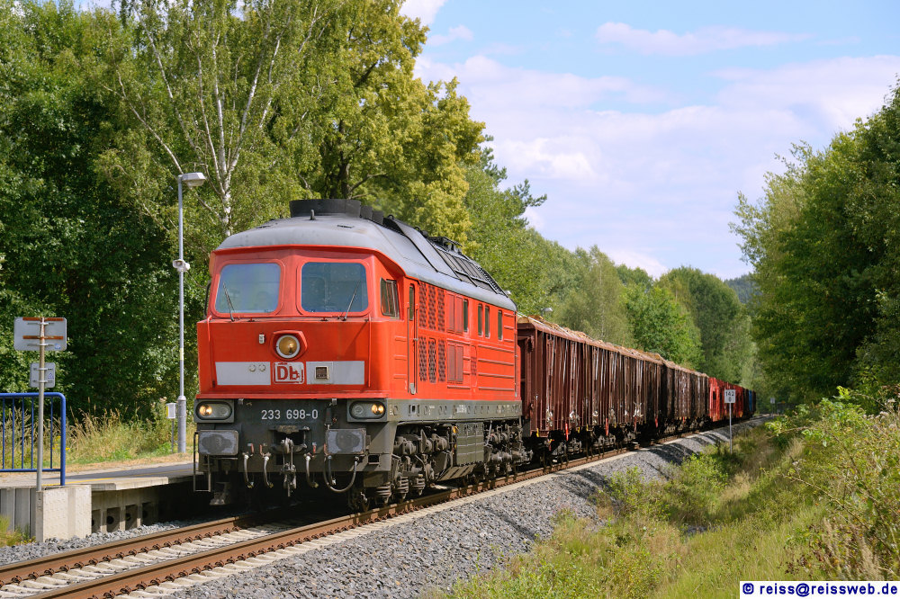 233 698 bringt einen Güterzug aus Cheb (Eger) nach Nürnberg (Pomezí nad Ohří, 11.08.2018).