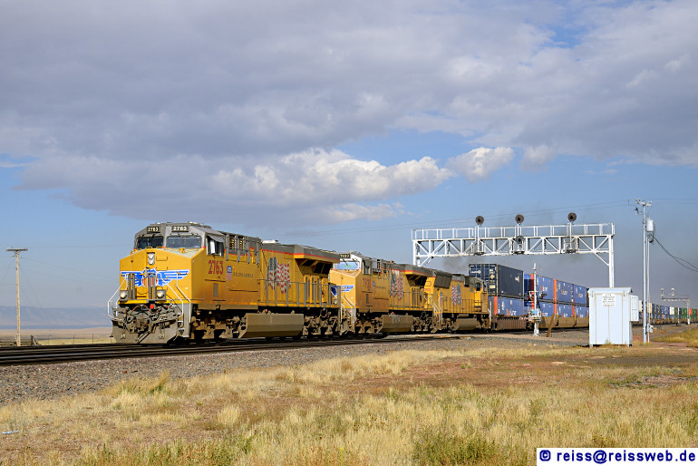 UP 2763 (GE ES44AC) fährt mit einem Doppelstock-Containerzug von Laramie hinauf zum Shermann Hill, weiter geht es dann wieder abwärts nach Cheyenne [WY] (17.09.2018).