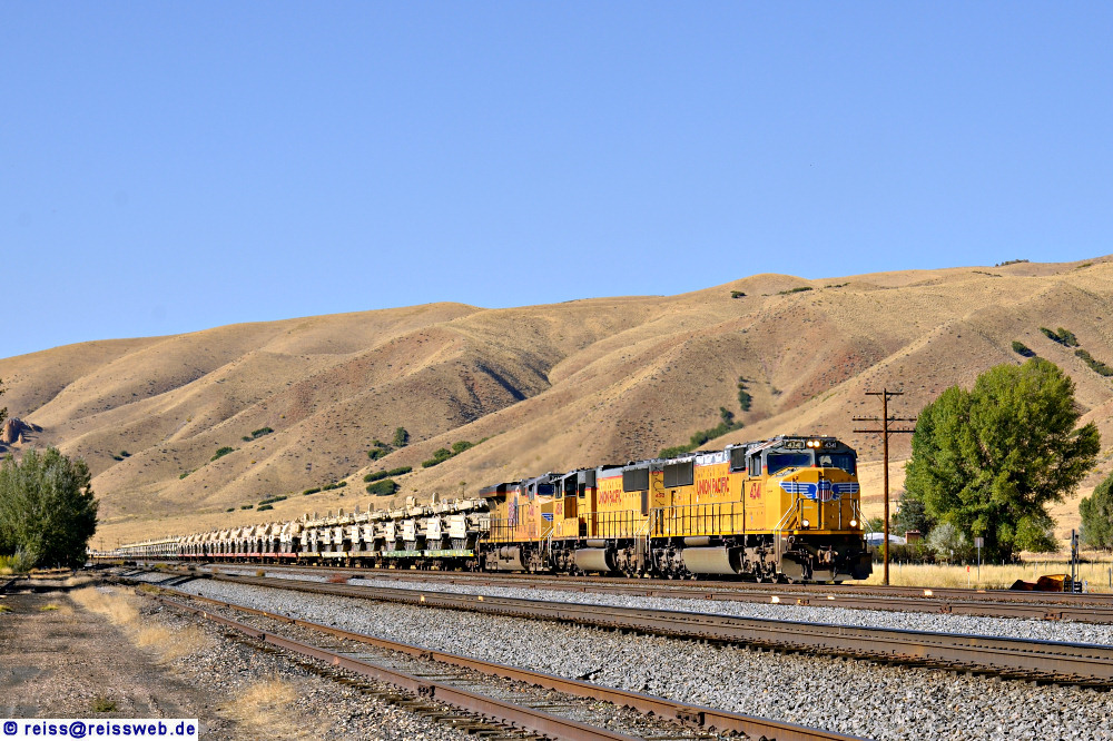 UP SD70M 4341, 4508 & GE ES44AC 7461 bringen einen Militärzug aus Utah über die Rocky Mountains ostwärts in Richtung Cheyenne [Wyoming] und erreichen den Eingang zum Echo Canyon (21.09.2018).