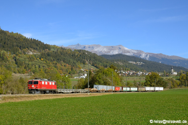 RhB Ge 4/4 I 610 führt den mittäglichen Lokalgüterzug von Landquart nach Ilanz (Castrisch, 09.10.2018).