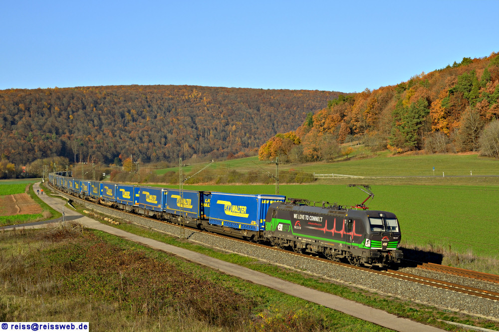 ELL 193 277 bringt einen KV-Zug durch das Maintal Richtung Süden (Wernfeld, 17.11.2018).