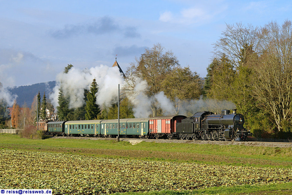| Vor 50 Jahren endete der Dampfbetrieb bei den SBB. Aus diesem Anlass unternahm C 5/6 Nr. 2969 eine Rundreise von Sulgen über Winterthur - Baden nach Koblenz. Die Rückfahrt führte über Eglisau und Winterthur zurück nach Sulgen (Kaiserstuhl, 01.12.2018). |