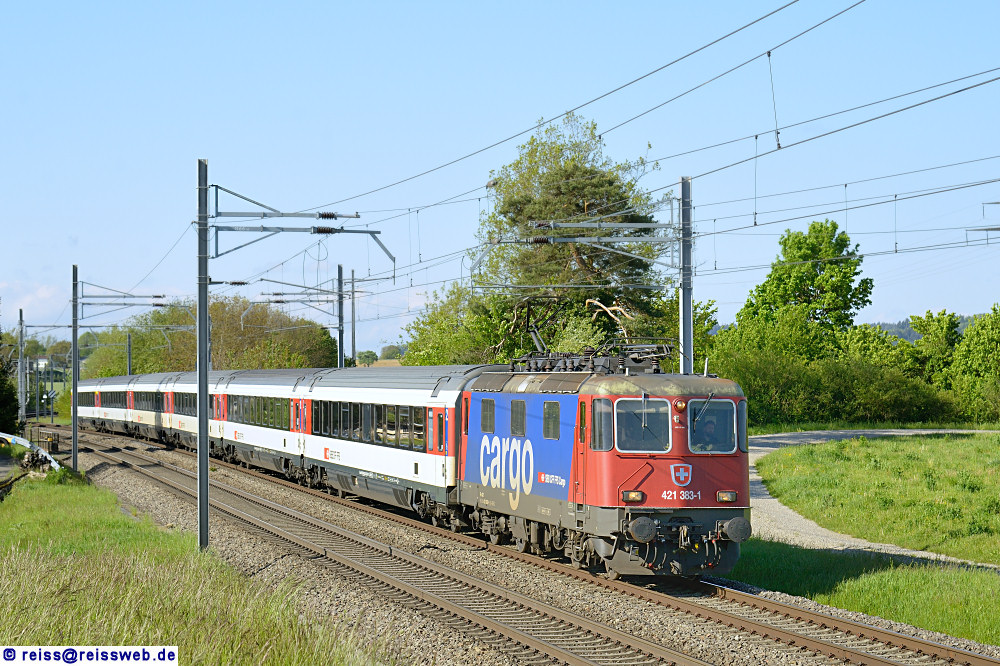 Re 4/4 II 421 383 bringt IC 282 von Zürich nach Singen (Jestetten, 13.05.2019).