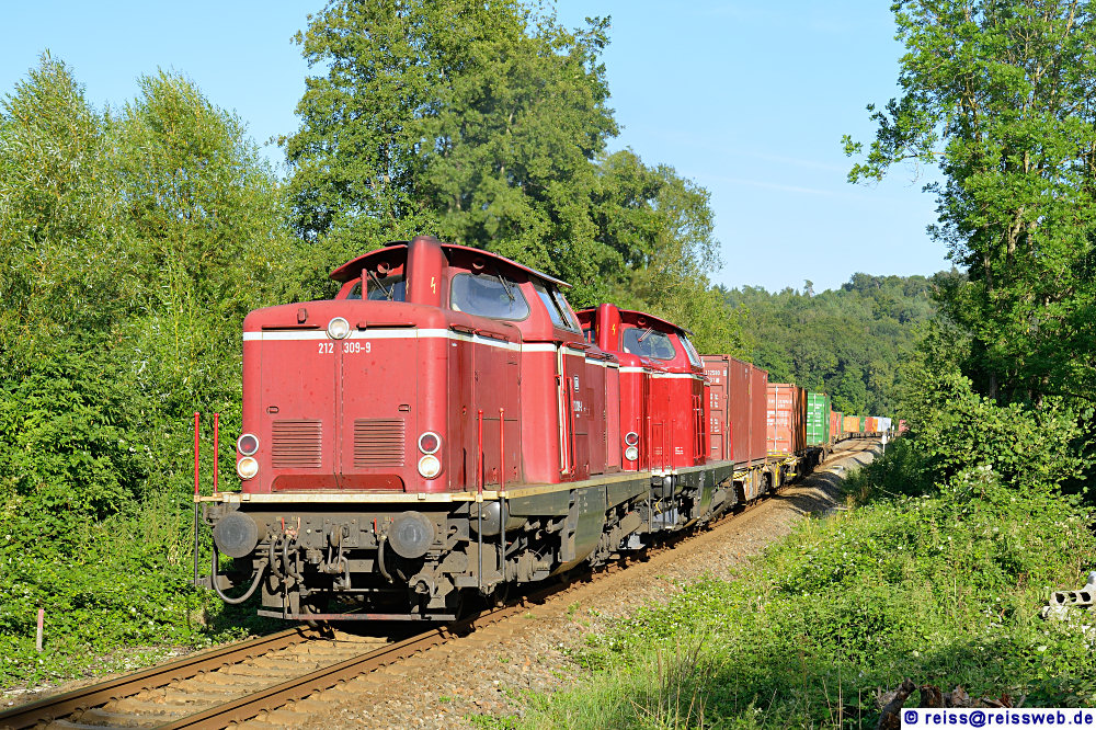 212 309 & 213 332 bringen einen Umleiter-KV (BoxXpress) von Singen nach Ulm (Stahringen, 23.07.2019).
