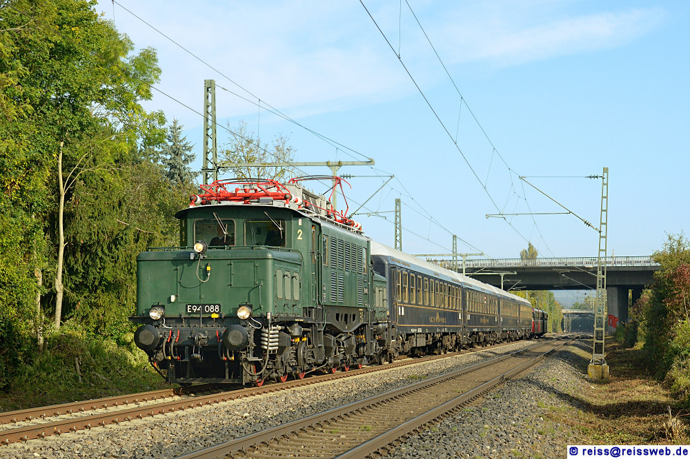 E 94 088 bringt vier Classic-Courier-Wagen und 798 469 "Roter Flitzer" plus Bei- bzw. Steuerwagen nach Singen, die beim Jubiläum "25 Jahre Seehas" als zusätzliche Züge zwischen Konstanz und Singen eingesetzt werden (Mühlhausen-Ehingen, 12.10.2019).