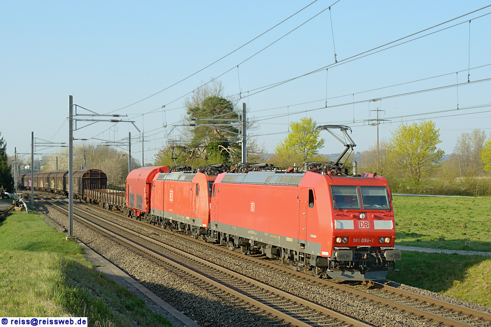 DB Cargo 185 098 & 137 bringen einen gemischten Güterzug von Chiasso nach Singen (Jestetten, 08.04.2020).