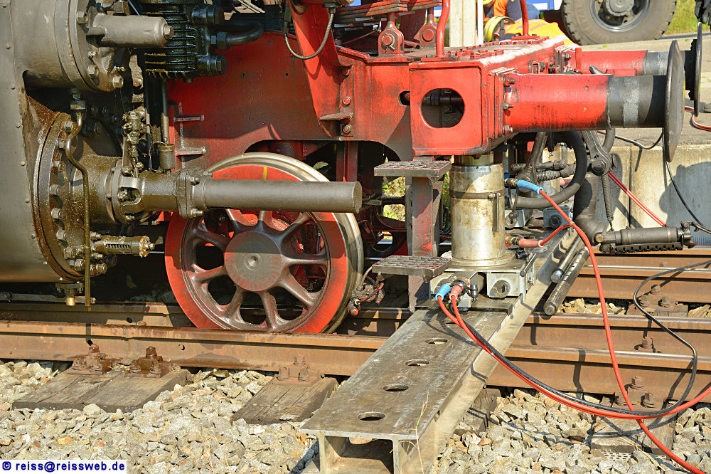 | Am 09.08.2020 entgleiste auf der Nachmittagsfahrt die FK 262 (BB 262) der Sauschwänzlebahn beim Umsetzen in Weizen. Hier sind die Vorbereitungen zur Eingleisung bereits weitgehend abgeschlossen. Nach dem Anheben wird die Lok seitlich verschoben und wieder auf die Schienen abgesenkt. |