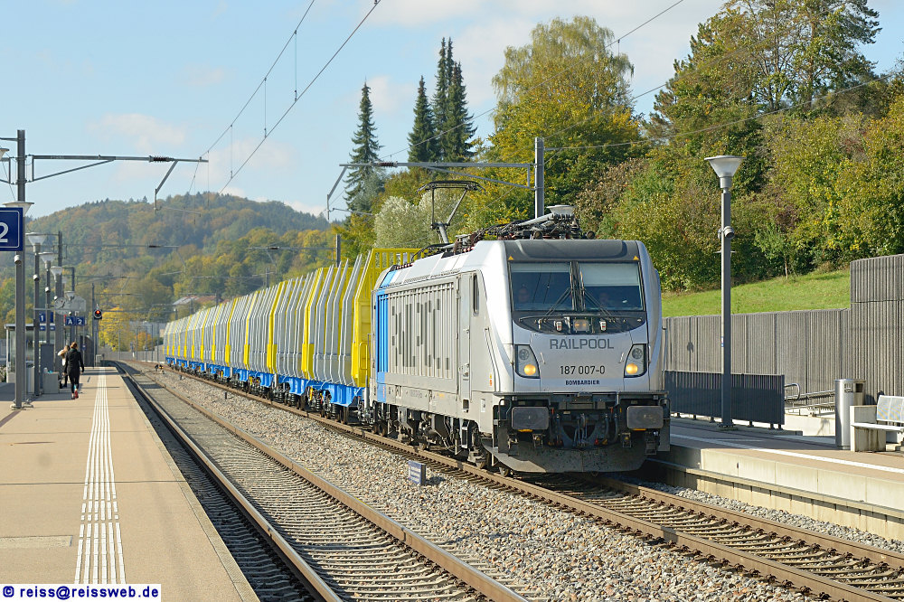 WRS 187 007 - angemietet von Railpool - bringt eine Garnitur leere Holzwagen nach Schaffhausen (Jestetten, 14.10.2020).