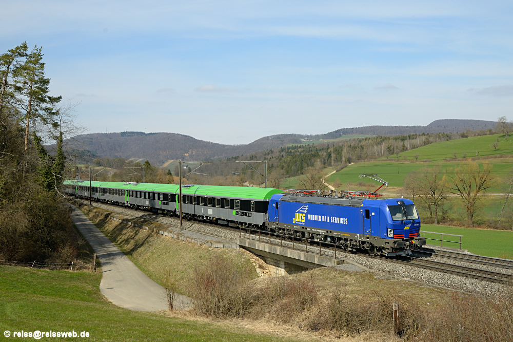 WRS 475 901 bringt fünf neue RALPIN-Begleitwagen von Freiburg i. Breisgau in den Rangierbahnhof Limmattal (RBL). Aufnahme zwischen Hornussen und Zeihen auf der Bözberg-Nordrampe (23.03.2021).
