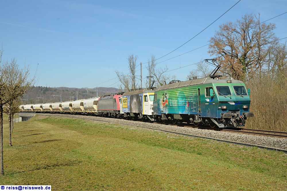EDG 446 016 "25 Jahre Voralpenexpress" & 015 "NEAT" bringen einen Zuckerzug von Muttenz nach Islikon (Frauenfeld). Mit im Zug ist die kalt mitlaufende 185 593, die den Zug aus Deutschland gebracht hat (Rietheim [AG], 29.03.2021).