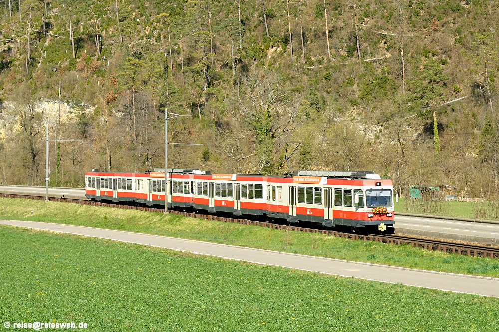 WB BDe 4/4 16 & 17 (mit im Zug die Beiwagen 116 & 117) fahren am vorletzten Betriebstag der 750-mm-Strecke von Liestal hinauf nach Waldenburg (04.04.2021).