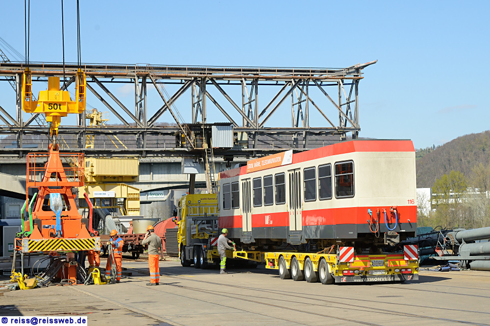 Bt 116 der Waldenburger Bahn (WB) trifft im Auhafen [Muttenz] ein und wird zwischengelagert, um gemeinsam mit den übrigen Fahrzeugen der WB Ende April 2021 mit dem Schiff in die Slowakei zu reisen (08.04.2021).