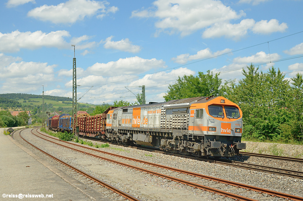 HVLE 330.3 [250 011-4] bringt einen Holzzug von Hüfingen nach Kaufering (Welschingen-Neuhausen, 10.07.2021).
