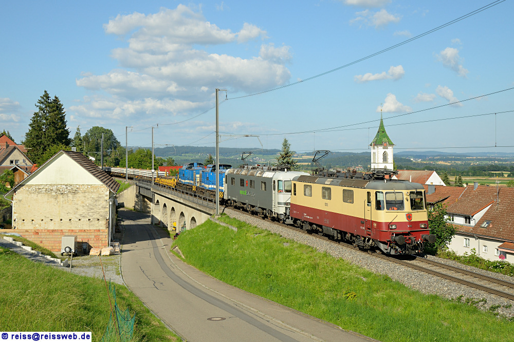 Re 4/4 II 11393 (421 393) von IRSI & Re 6/6 11603 (620 003) von Railadventure bringen einen Schwellenzug von Schaffhausen nach Herzogenbuchsee. Mit im Zug sind V100-SP-009 & SP-007 von Spitzke Logistik (Lottstetten, 18.07.2021).