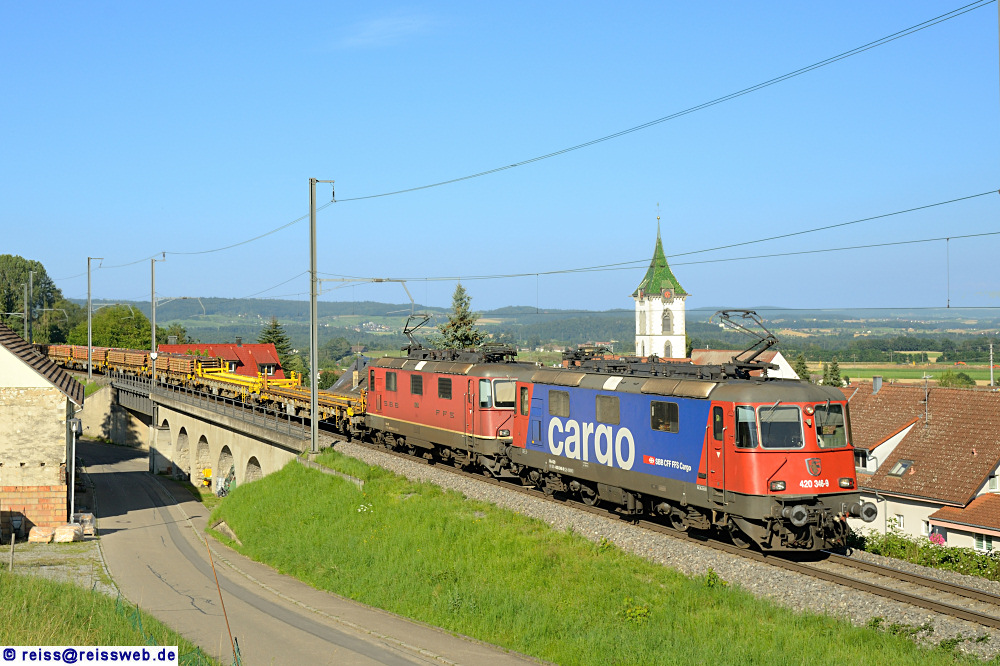 SBB Cargo 420 346 & 296 bringen einen Zug mit Altschwellen von Schaffhausen in den Rangierbahnhof Limmattal (Lottstetten, 29.08.2021).