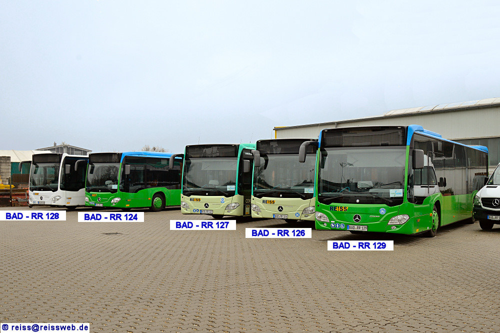 Alle Reiss-Citaro auf dem Betriebshof in Baden-Oos (v.l.n.r.): BAD-RR 128 (weiss, gebraucht), ..124 (Mild-Hybrid, Bj. 2020), ..127 (Bj. 2017), ..126 (Bj. 2014), ..129 (Mild-Hybrid, Bj. 2019), aufgenommen am 26.12.2021.