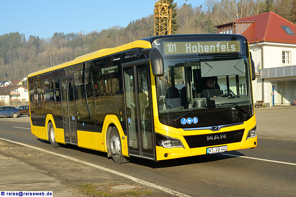 | MAN Lions City 12C "EfficientHybrid" ist auf der VHB-Linie 101 von Stockach nach "Hohenfels"unterwegs. Die Gemeinde besteht aus fünf Ortsteilen mit insgesamt 24 Dörfern, Weilern und Höfen, ein eigentliches Dorf "Hohenfels" gibt es nicht. Verwaltungssitz ist Liggersdorf. (14.01.2022). |
