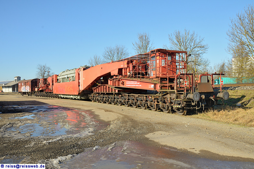 | Uaai 838 [86 80 996 4 900-6 D-NESA] ist ein 24-achsiger Schwertransportwagen der Fa. Kübler, eingestellt bei der NeSA. Am 14.01.2022 steht er mit einem Trafo beladen in Herbertingen. Der Trafo kam auf der Strasse aus Trossingen und geht vermutlich zurück zum Hersteller. |