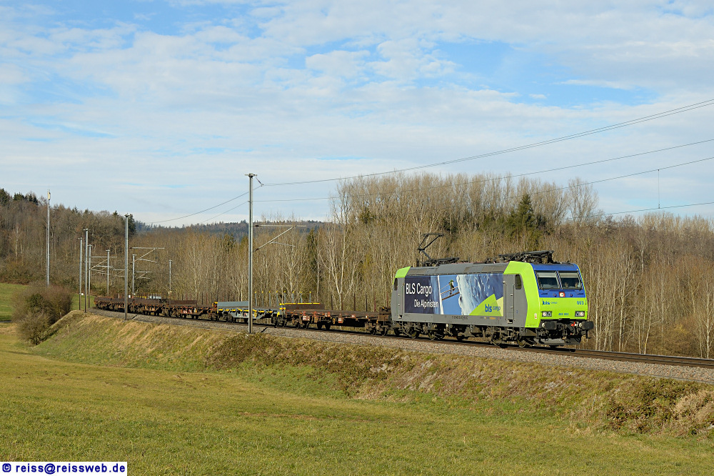 BLS 485 003 bringt die Leergarnitur des wöchentlichen Alu-Zuges von Singen nach Basel (Lottstetten, 29.01.2022).