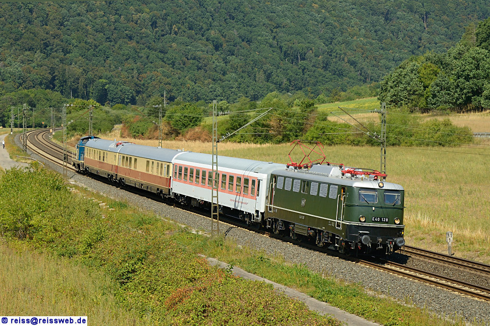 E 40 128 in der typischen Zugkonfiguration des DB Museums Koblenz, wenn Fahrzeuge abgeholt oder überführt werden müssen. Am Schluss des Zuges läuft 212 372 (Wernfeld, 09.08.2022).