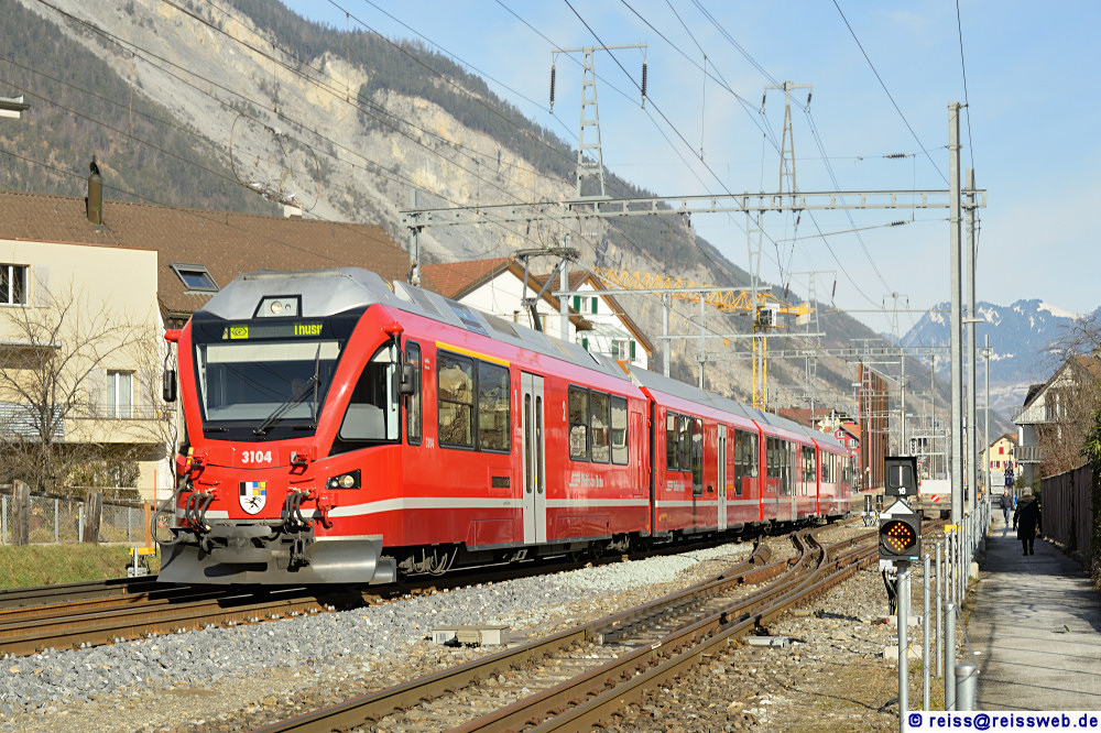 RhB ABe 4/16 3104 ist als S2 von Chur nach Thusis unterwegs (Domat-Ems, 29.01.2023).