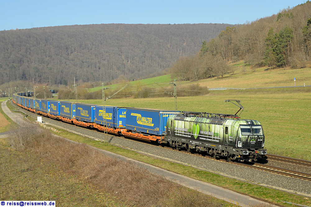TXL 193 582 "Unser Herz schlägt grün" bringt einen Walter-Zug durch das Maintal Richtung Süden (Wernfeld, 01.03.2023).