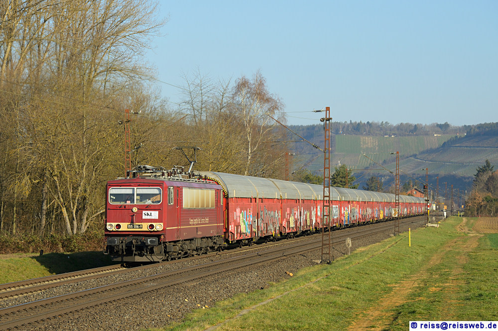 CLR (Cargo Logistik Rail-Service GmbH) 155 016 (vermietet an SKL [Schienen Komplex Logistik Magdeburg GmbH & Co. KG]) bringt eine Garnitur Autotransportwagen durch das Maintal Richtung Süden (Himmelstadt, 02.03.2023).