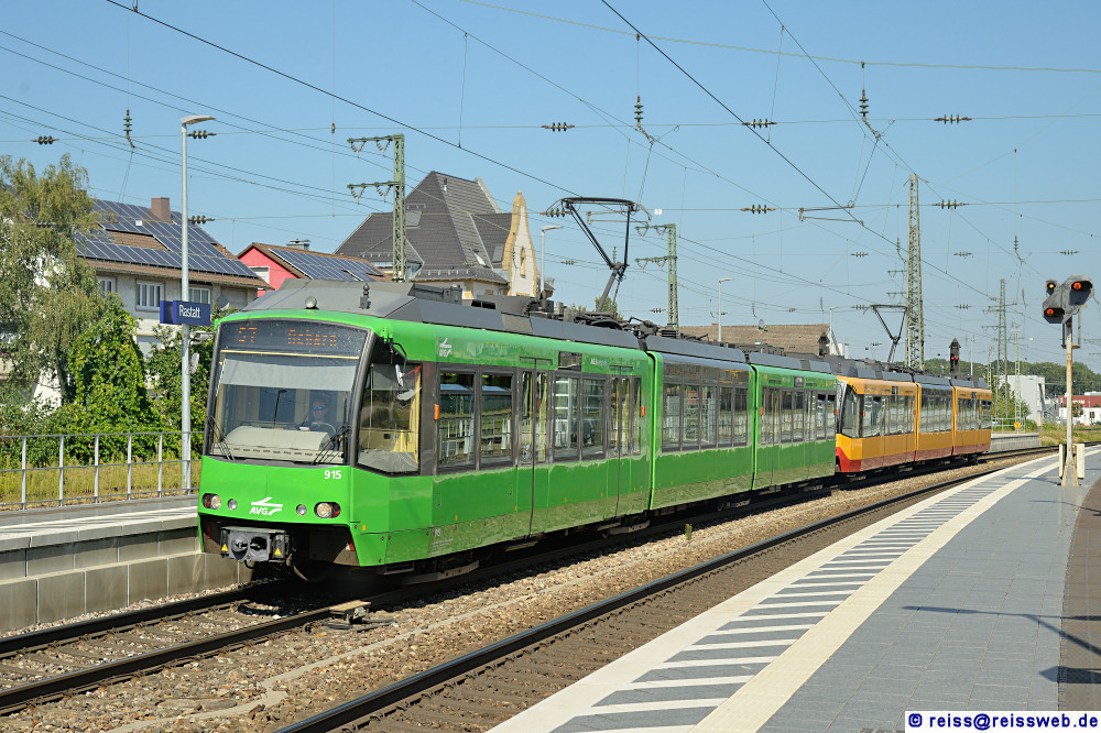AVG GT8-100D/2S-M 915 (das einzige grüne Fahrzeug der Flotte) und ein weiteres Fahrzeug sind als S7 von Karlsruhe nach Achern unterwegs (Rastatt, 09.09.2023).