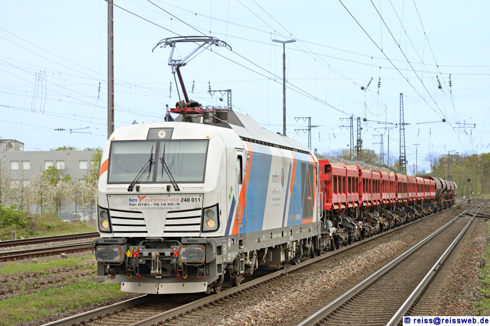 Vectron Dual-Mode 248 011 von Bm Bahndienste bringt einen Schotterzug durch Rastatt nach Süden (05.04.2024).