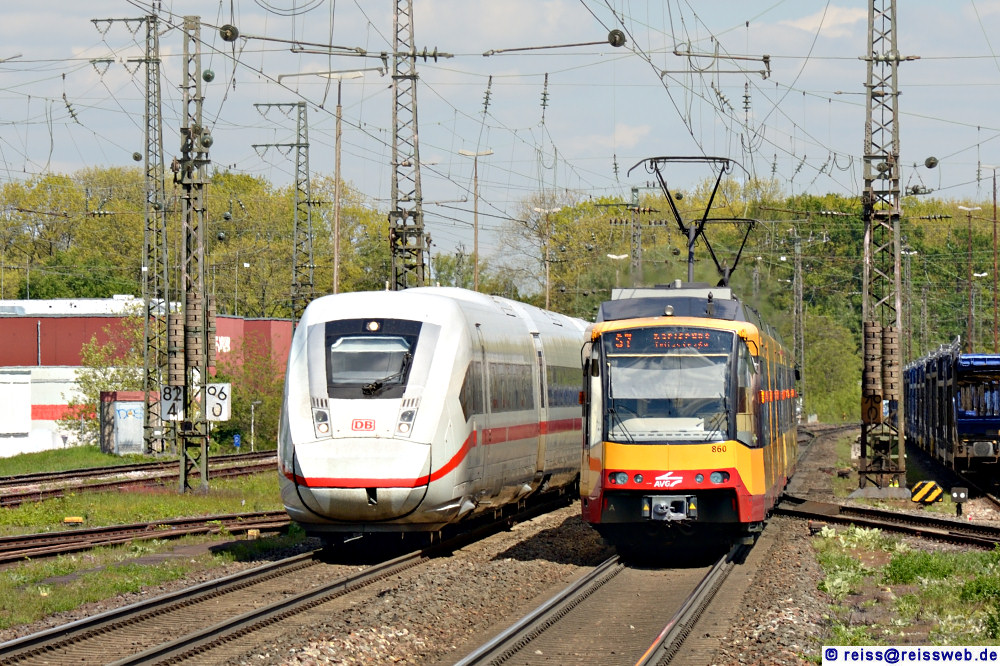 Ein unerkannt gebliebener ICE4 nach Basel begegnet einer AVG S7 mit Ziel Karlsruhe (Rastatt, 23.04.2024).