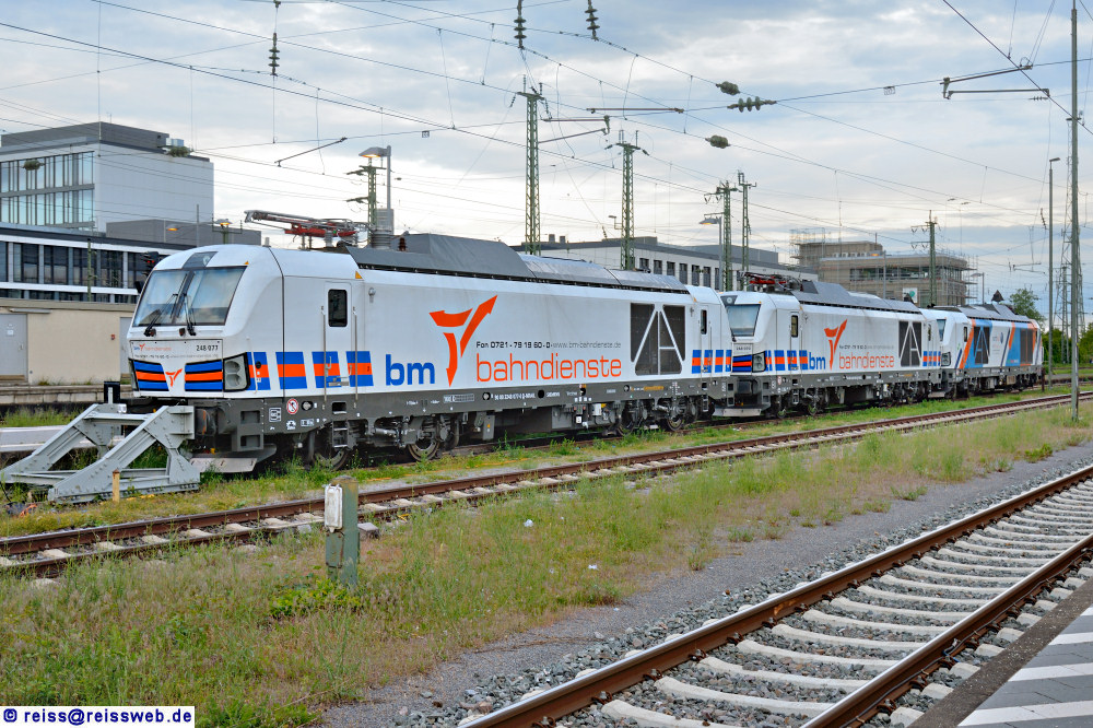 248 077 & 070 & 011 (v.l. n.r.) stehen am Wochenende 27./28. April 2024 in Karlsruhe Hbf auf dem von Bm-Bahndienste gemieteten Abstellgleis (27.04.2024).