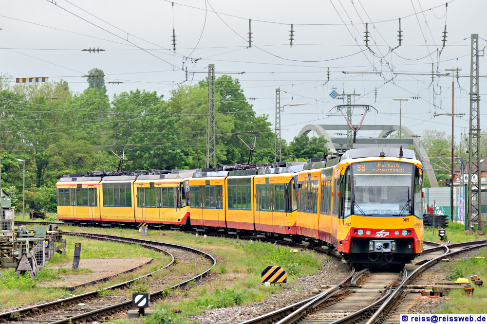 | Eine Dreier-Kombination von AVG GT8-100D/2S-M ins Murgtal kommt nicht oft vor, aber sie wird planmässig gefahren. Meist wird die letzte Einheit in Forbach abgehängt, die beiden vorderen Einheiten fahren nach Freudenstadt bzw. nach Bondorf (Rastatt, 02.05.2024). |