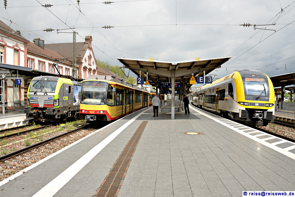 RE 7 1462 515 fährt nach Halt als erster der drei Züge aus Rastatt ab (rechts im Bild), ihm folgt AVG 922 (Mitte) und zuletzt wird BLS Cargo 475 417 weiterfahren (07.05.2024).