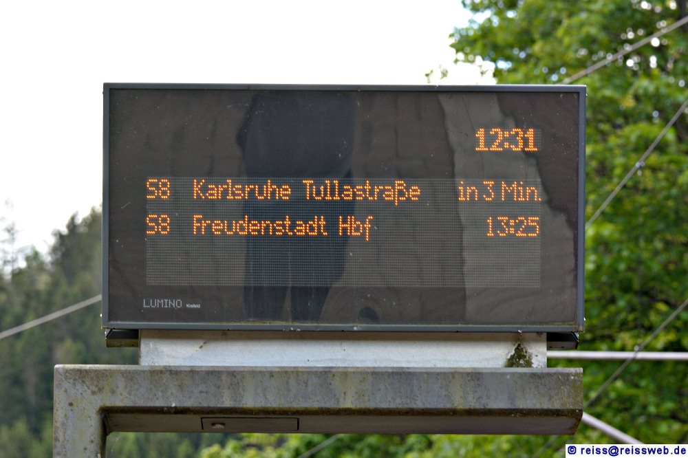 | Sechs Minuten Aufenthalt (wenn die Züge pünktlich sind) reichten für Aufnahmen von beiden Zügen (12:25 Uhr -> FDS/12:31 Uhr -> KA) und einige Bahsteigbilder. Es wird nur bei Bedarf gehalten. Die Kreuzung findet im circa drei Kilometern entfernten Bahnhof Schönmünzach statt (Kirschbaumwasen, 28.05.2024). |