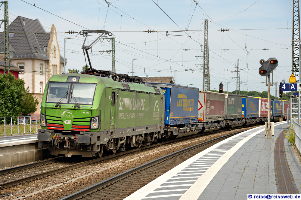 TXL 193 283 "Shining Example" bringt einen KV-Zug durch Rastatt nach Süden. Die Lok war in der Vergangenheit auch schon sauberer, ist aber ein TXL-Problem (08.06.2024).