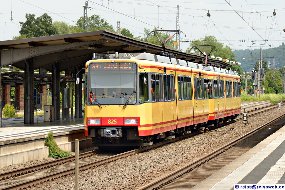 AVG 825 und ein weiterer Hochflurer enden als S31/S32 aus Odenheim/Menzigen ausnahmsweise wegen Bauarbeiten in Karlsruhe-Durlach (18.06.2024).