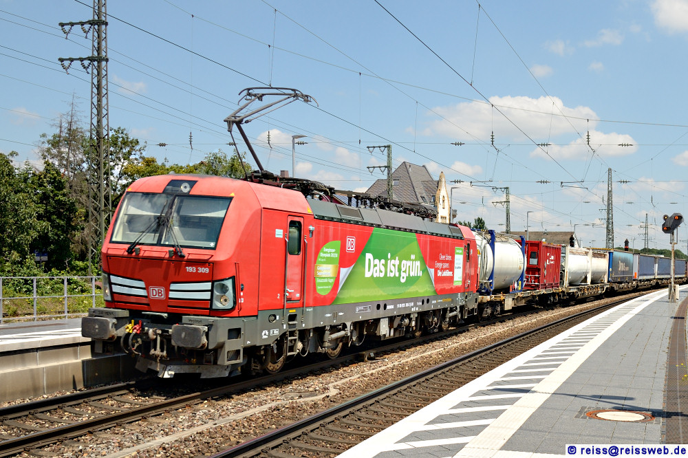DB Cargo 193 309 "Das ist grün" bringt einen KV-Zug durch Rastatt nach Süden (24.06.2024).