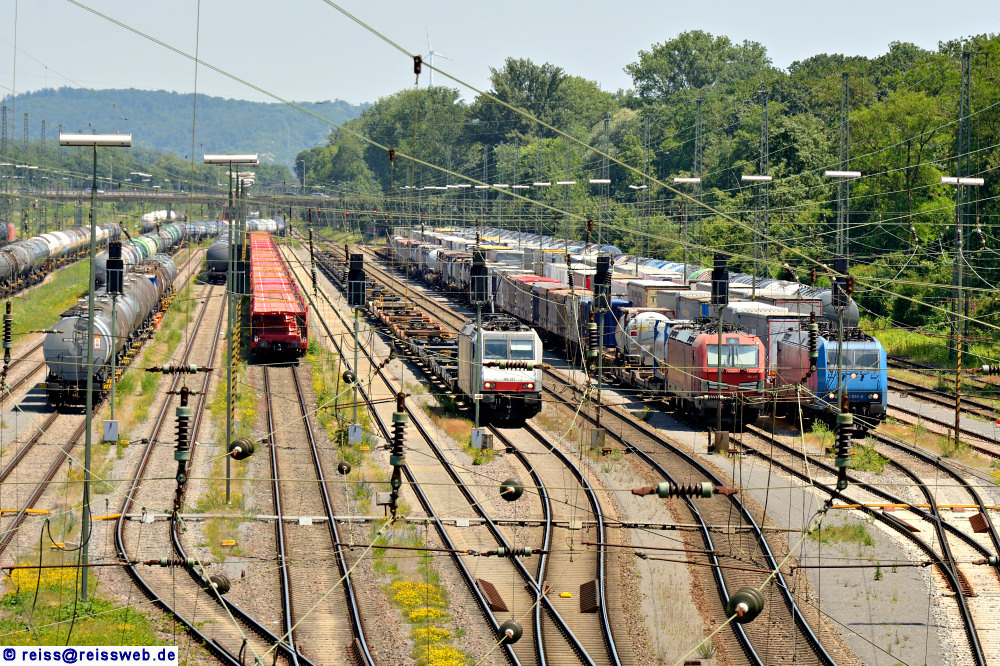 | Blick auf die Ausfahrgruppe im Karlsruher Rbf. Rangiert im Stil der Bundesbahnzeiten wird eigentlich nicht mehr, von Wagenausreihungen oder Bauzüge zusammenstellen abgesehen. Eigentlich müßte man die im Bild sichtbaren Gleise "Durchfahrgruppe mit Haltemöglichkeiten für Pause oder Personalwechsel" nennen (25.06.2024). |