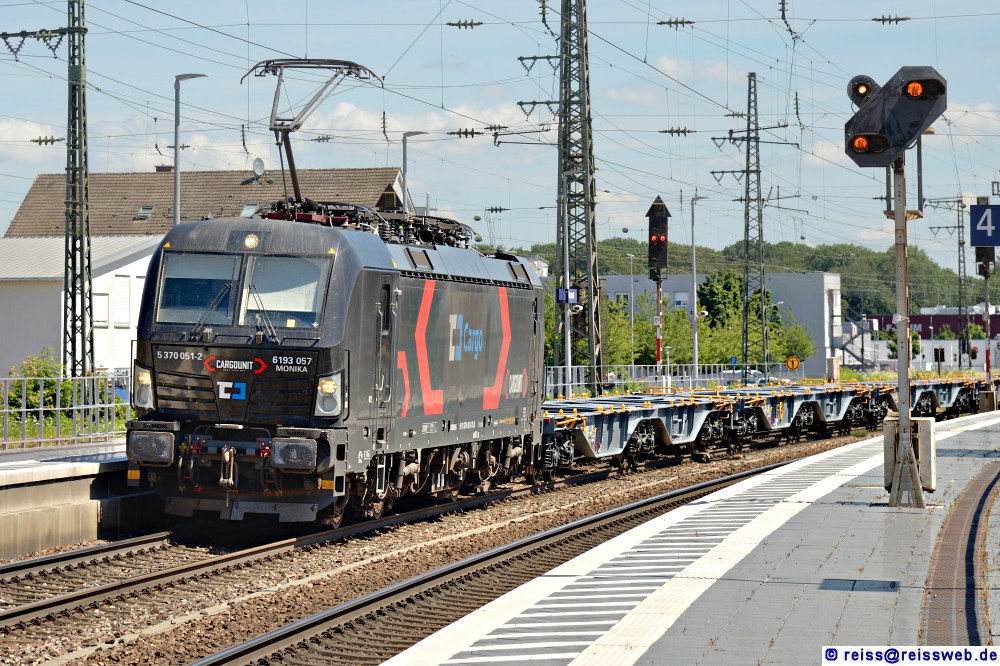 ČD 5 370 051-2 (LZB-Nr. 6193 057), führt einen Zug mit leeren (offenbar werksneuen) Containertragwagen durch Rastatt nach Süden. Eigentümer der Lokomotive ist der polnische Lokomotivvermieter Cargounit (08.07.2024).