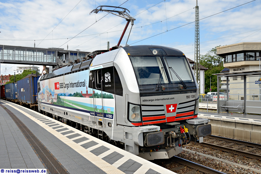 SBB Cargo 193 139 "Italienpiercer" bringt einen Container-Zug durch Rastatt nach Norden (11.07.2024).