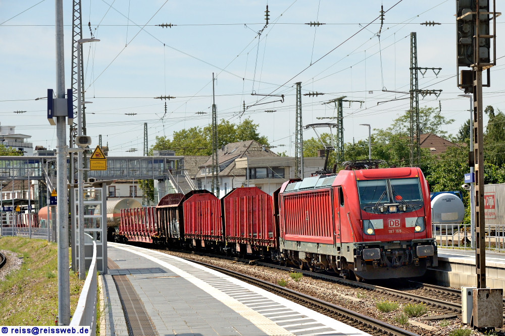 DB Cargo 187 169 passiert in Fahrtrichtung Norden Rastatt im Gegengleis (Gleis 3), was sehr selten vorkommt. Dabei war Gleis 4 (Richtungsgleis Nord) nicht blockiert (25.07.2024).