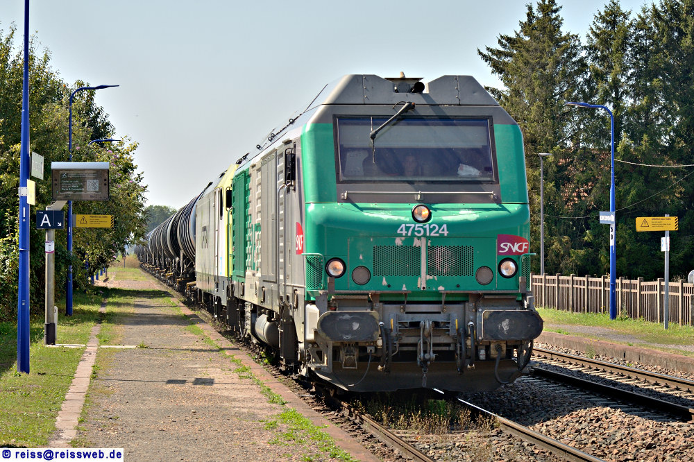BB 475128 bringt eine Captrain 185 (oder 186?) und einen Kesselwagenzug von Offenburg nach Wörth (Rountzenheim, 28.08.2024).