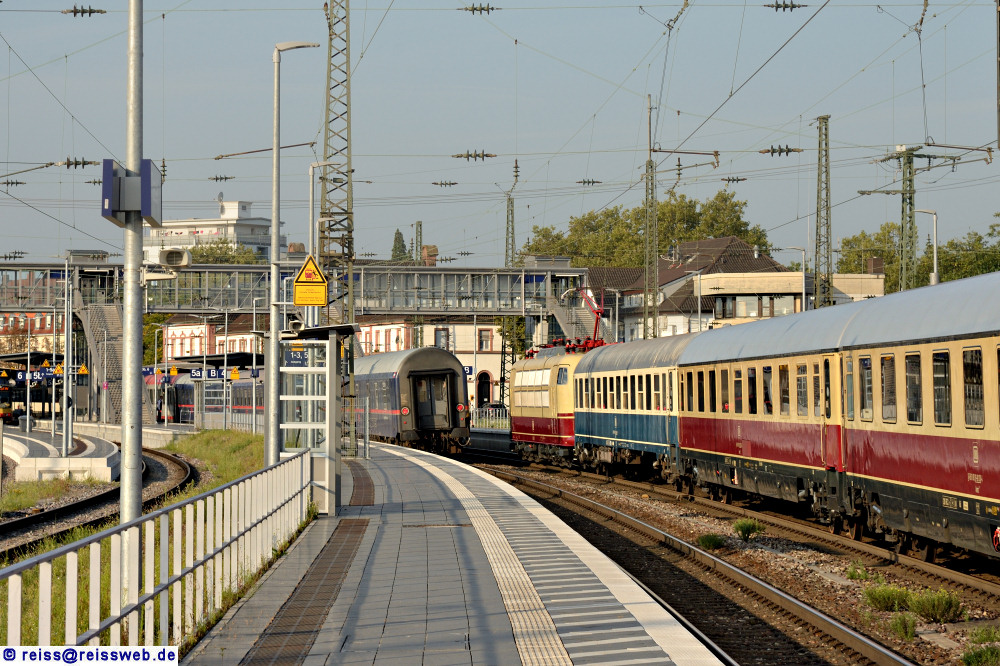 103 113 mit ihrem Sonderzug überholt einen verspäteten Nachtzug, der dafür auf das Gegengleis ausgewichen ist (Rastatt, 31.08.2024).