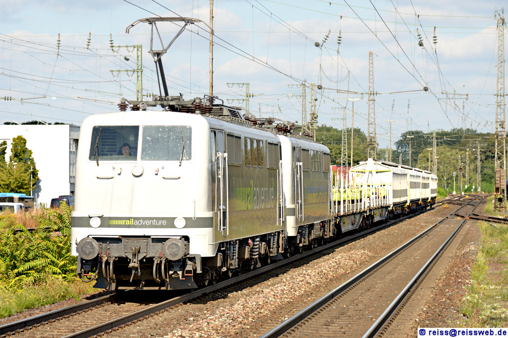 | Railadventure (RADVE) 111 029 & 082 bringen zwei Loco Buggy-Transportwagen und vier Kuppelwagen nach Basel, wo sie von einer schweiztauglichen Lokomotive weiter nach Bussnang zu Stadler gebracht werden. Wahrscheinlich werden damit Innotrans-Austellungsfahrzeuge nach Berlin überführt (Rastatt, 15.09.2024). |