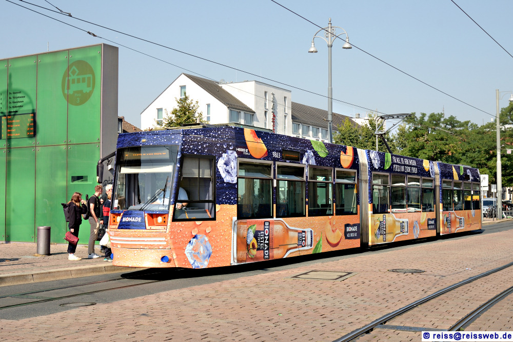 HEAG 9863 "Bionade" wurde aufgenommen in der Haltestelle Hbf in Darmstadt. Die Wagen der Baureihe ST13 sind die ältesten Niederflurfahrzeuge bei der HEAG (Darmstadt, 18.09.2024).
