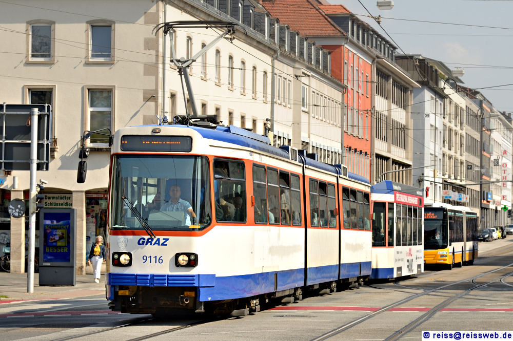 | HEAG 9116 "Graz" fährt auf die Haltestelle Rhein-Neckarstraße zu. Die Fahrzeuge der Baureihe ST12 sind die letzten Hochflurwagen in Darmstadt, sie verkehren aber i.d.R. mit Niederflurbeiwagen SB9; damit ist der Zugang für Behinderte gewährleistet (18.09.2024). |
