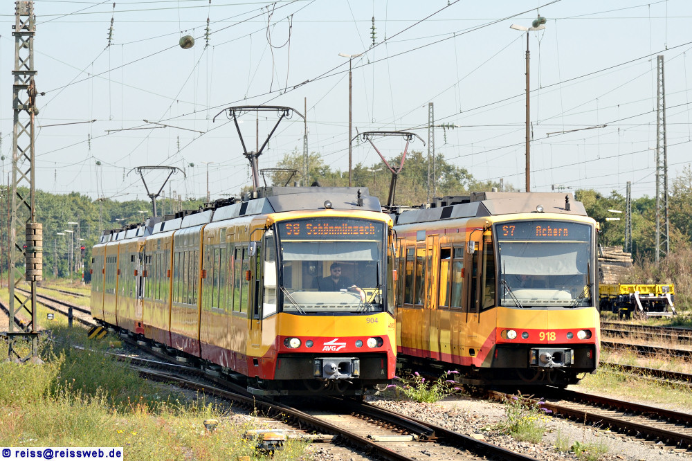| Zwei AVG GT8-100D/2S-M-Doppeltraktionen warten in den Verlängerungen der Bahnsteiggleise 5 & 6 auf ihre Abfahrten nach Schönmünzach (S8) und nach Achern (S7). Grund für die Wende in Rastatt war eine Sperrung auf der Durmersheimer Strecke (20.09.2024). |