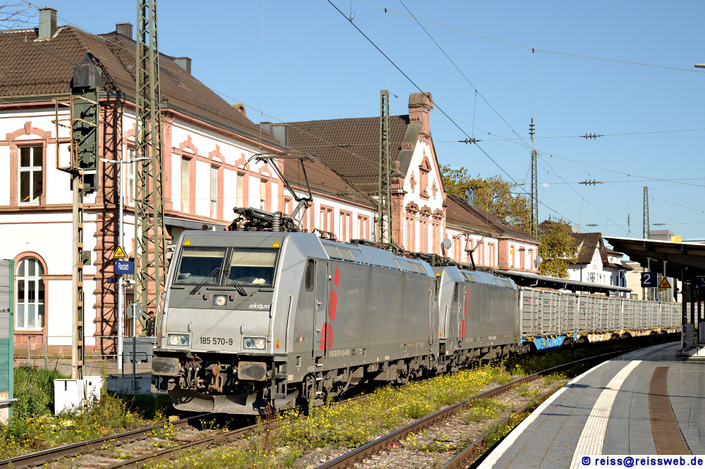 Akiem 185 570 & 578 bringen einen Rübenzug durch Rastatt nach Islikon (23.10.2024).